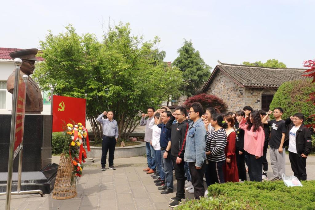 在李克农故居,大家参观了将军大量的生平事迹图片和文献资料,全体党员在将军铜像前,由院党委书记汪春胜领誓,重温入党誓词。