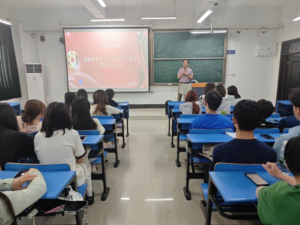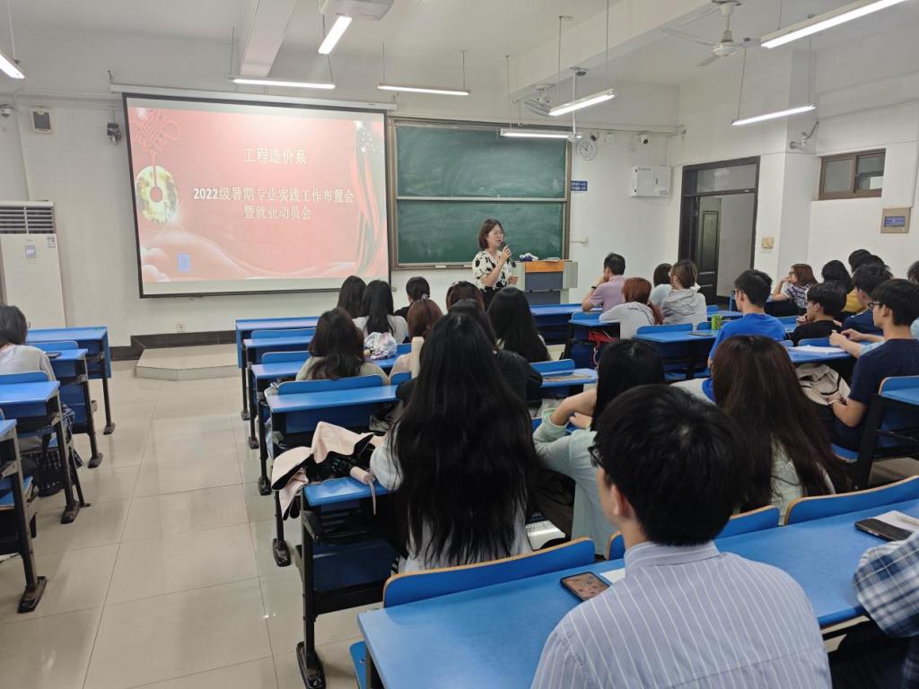 工程造价专业在教D208教室举办考研实习动员会。会议由2022级辅导员赵玉婷主持,工程造价系系主任王治国,工程造价系教师白娟、李平、李艳及专业2022级全体学生参会。