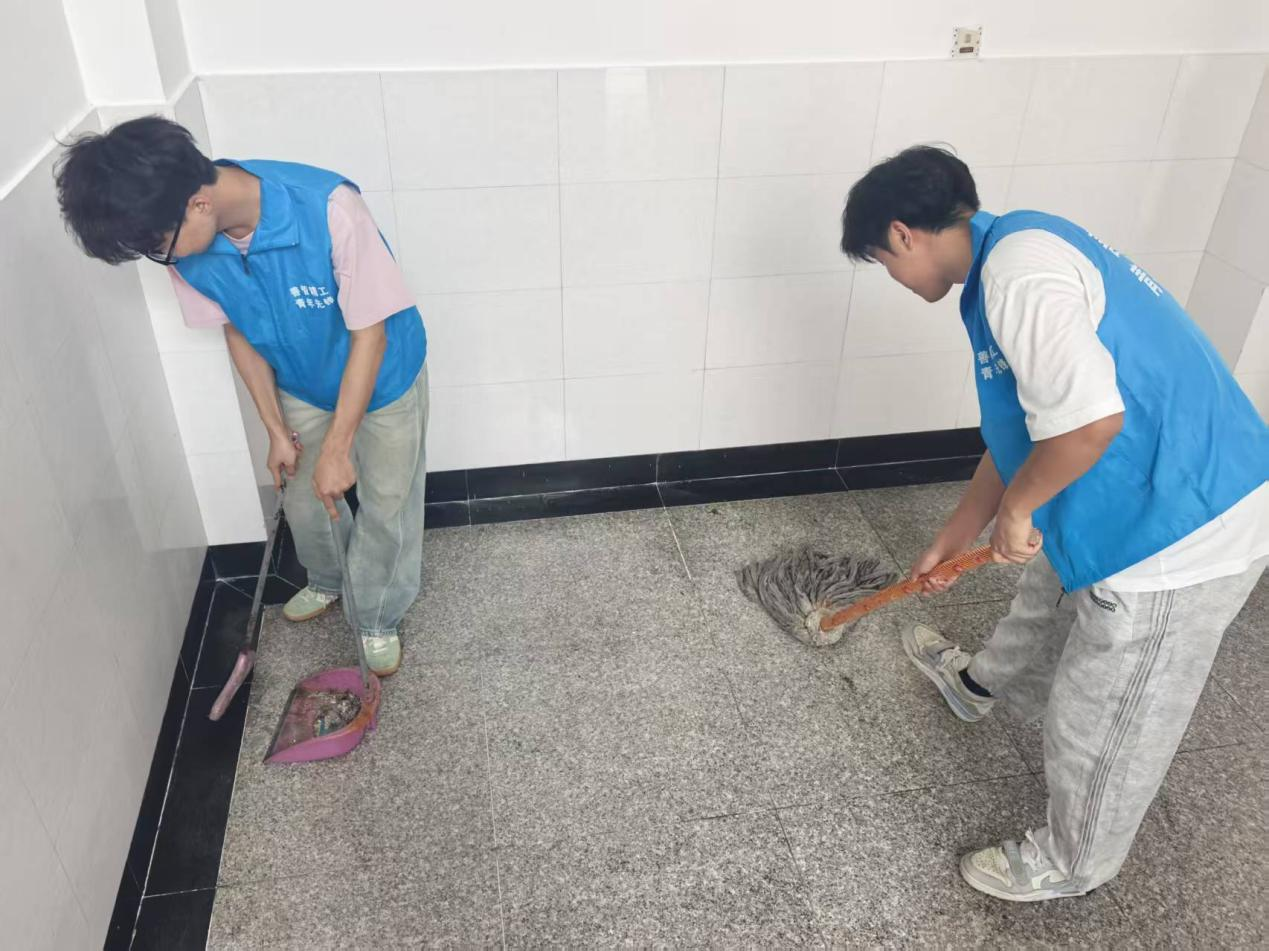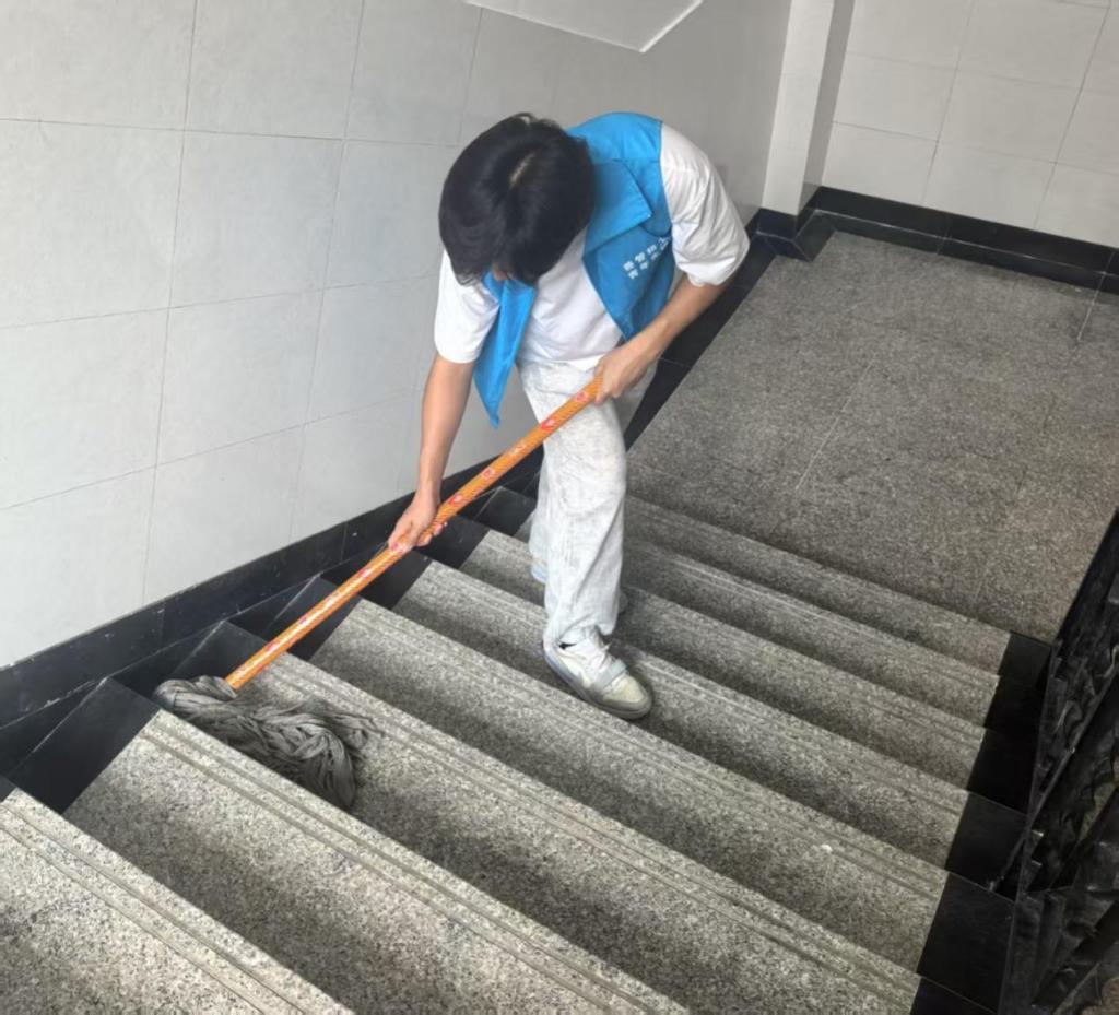 活动当日,志愿者准时集合,有序领取扫帚、抹布、垃圾袋等清洁工具,随后对教学楼指定区域展开系统清扫工作。各小组采用“分区包干”模式,分工明确,重点清理了教室地面、走廊、楼梯等公共区域的纸屑、灰尘等垃圾,并对墙角蛛网、楼梯扶手的污渍等卫生死角进行了彻底清洁。大数据管理与应用244班王泽表示:“这次活动让我深刻体会到劳动的价值,通过亲身参与校园环境维护,我们更加懂得珍惜劳动成果。”