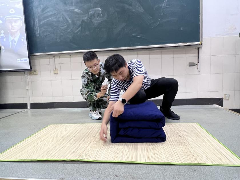 大会伊始,李思雨以九三阅兵背后的动人故事作为开篇,引入话题,围绕军训期间的安全管理细则、科学合理的作息安排以及严谨的纪律规范等内容,提醒同学们务必做好充分准备,严格恪守训练纪律,切实增强自我保护意识,以保障整个军训过程能够安全、有序地推进。退伍士兵邢朝玮同学现场展示了军被折叠、日用物品规范摆放等内务标准,并指导多位新生动手实操,同学们在实践过程中深刻感受到军队严谨细致的作风要求。赵颖在动员讲话中指出,军训不仅是对身体的锻炼,更是对意志的锤炼和品格的塑造,鼓励同学们,一是要珍惜军训机会,发扬团结协作、吃苦耐劳的精神,在训练中不断超越自我;二是要将军训中培养出的优良作风延续至今后的大学学习与生活中,真正把军训收获转化为未来学习与生活的内在动力;三是继承发扬学院的优良传统,以高标准要求自己,展现出管工学子的坚韧品格与良好风貌。会议最后,全体新生身姿挺拔、肃立如松,高举右拳,以激昂之姿进行了军训宣誓。