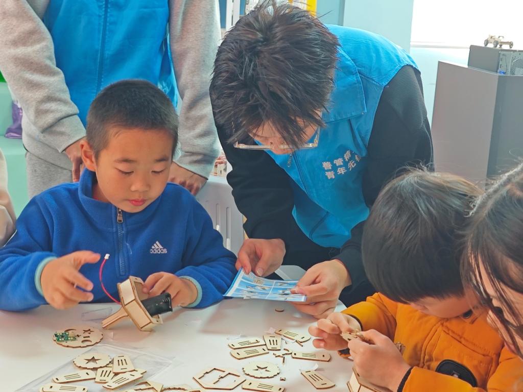 活动伊始,志愿者结合生活实际,为社区儿童讲解安全用电常识及实操注意事项,筑牢安全意识第一道防线。在随后的智能语音台灯DIY环节,志愿者以生动易懂的语言配合趣味演示,系统讲解台灯的工作原理,逐一介绍元器件功能,细致展示组装流程。操作阶段,志愿者们“一对一”结对指导,从结构拼接到电路连接,耐心辅助。孩子们在志愿者的引导下专注投入、积极协作,逐步完成底座固定与灯体组装,亲手将零散部件打造成可实现语音控制的智能台灯,在实践中感受工程与科技的乐趣。