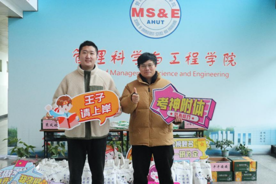 学院领导为考研学子精心准备了考研加油包,助力学生“逐梦最后一公里”。礼包中的文具袋寓意“逢考必过,金榜题名”;橙子寓意“‘橙’心如意,心想事‘橙’”;苹果象征“‘苹苹’安安,‘苹’稳上岸”,士力架代表“横扫难题,为你加分添士气”。每一样礼品,都寄托着学院对考研学子的殷切期望和美好祝愿,希望在考研礼包的加成下,所有考研学子都能好运连连,凯旋而归。