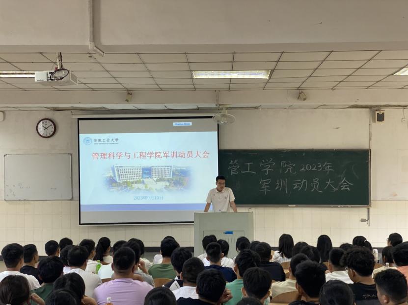 2023级新生军训动员大会在东阶101举行。2023级新生辅导员刘瑜、曹宇及2023级全体新生参加大会。