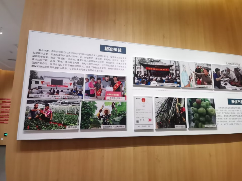 图为实践队员在档案馆内所见的精准扶贫以及淮优产品展板。中国青年网通讯员 朱泽静 摄