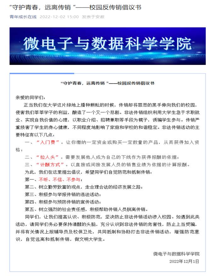 为了增强学生防范传销意识,11月中旬至12月初,我校开展了“守护青春,远离传销”校园防范传销宣传教育活动。本次活动由校学生工作部(处)、校团委、安全保卫部(处)主办,U球直播