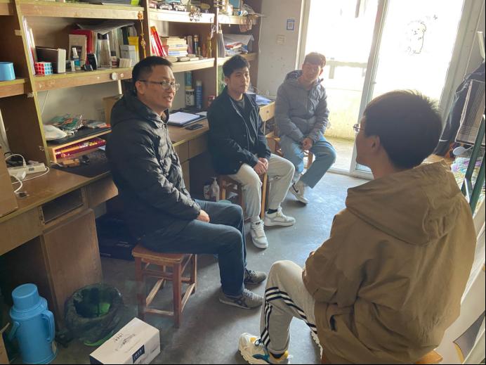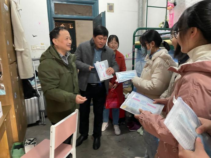 党政领导走进宿舍看望慰问考研学子,发放营养牛奶及考研文具包,送上学院的关心与祝福。院领导汪春胜、汪和平、王功成、郜振华、王付宇以及毕业班辅导员赵玉婷分组深入宿舍、看望考研学生。