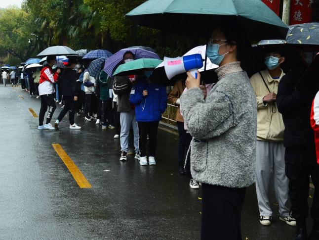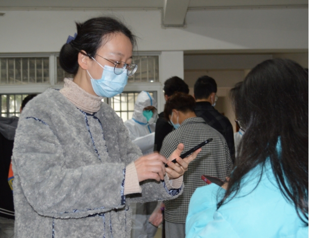 任静到校医院指挥并维护核酸检测现场的秩序,组织学生有序进行核酸检测并提醒学生注意自身安全防护,提高检测效率。万媛媛化身“大白”奋战抗疫前线,主动担任核酸检测采样点扫码登记员,减轻了医务工作者的压力。“第一次穿上白色的‘抗疫战袍’,第一次沉浸式防疫体验,让我终于有机会践行自己的诺言,守护我们的校园,我有战必应!”万媛媛说道。