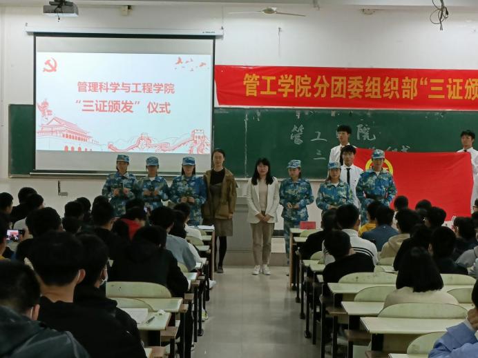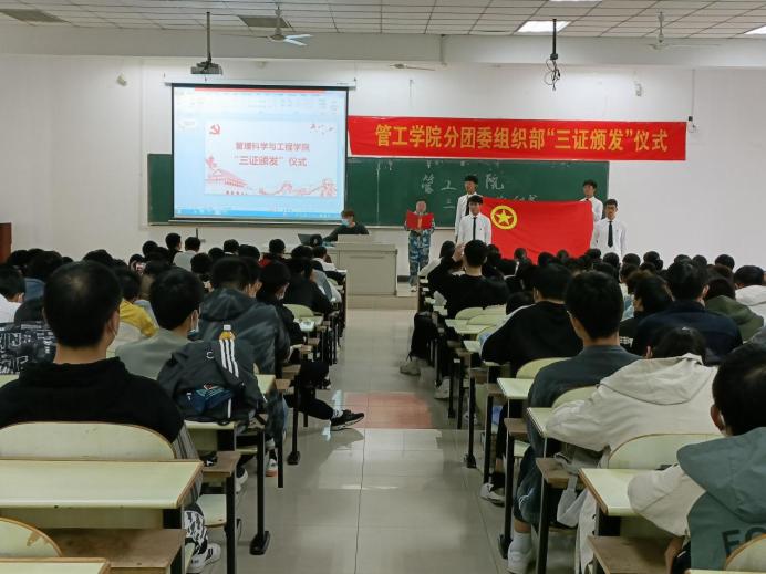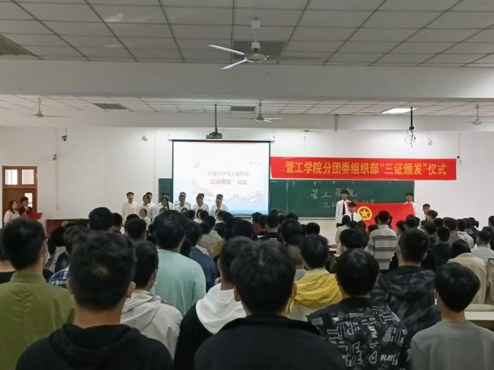 在教三南203举办了“三证颁发”仪式暨团学第一课。院团委书记万媛媛、21级辅导员任静出席仪式,学院2021级全体团员到场参与了本次活动。