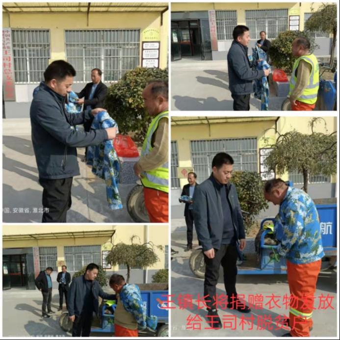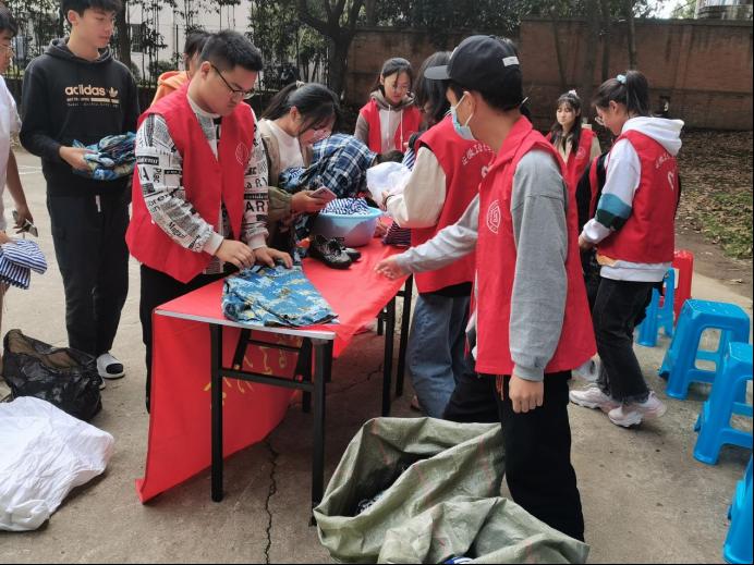 2021年10月17日,学院通过平台宣传和志愿者组织动员开展相关军训服装回收活动,并于2022年11月22日通过相关渠道将服装资源赠予淮北百善镇扶贫点。回收活动共接收全院230余人次助力,衣物经处理后由百善镇王镇长捐赠给王司村贫困户和当地环卫工人。