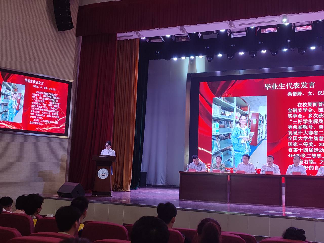 毕业生代表桑倩婷表达了对学校、学院和老师们的感恩之情,并结合自己大学生活的成长经历,鼓励同学们要艰苦奋斗、成就自我。在校生代表汪航表示要向2021届毕业生学习,以他们为榜样,勤勉刻苦,用自己的实际行动贡献青春力量。教师代表吴凡老师表达了对毕业生的祝贺与祝福。