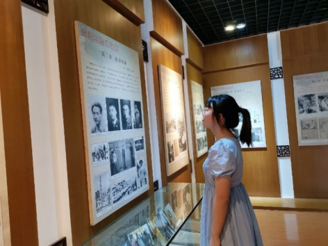 图为实践队员正在认真阅读馆内陈列的文字和图片。