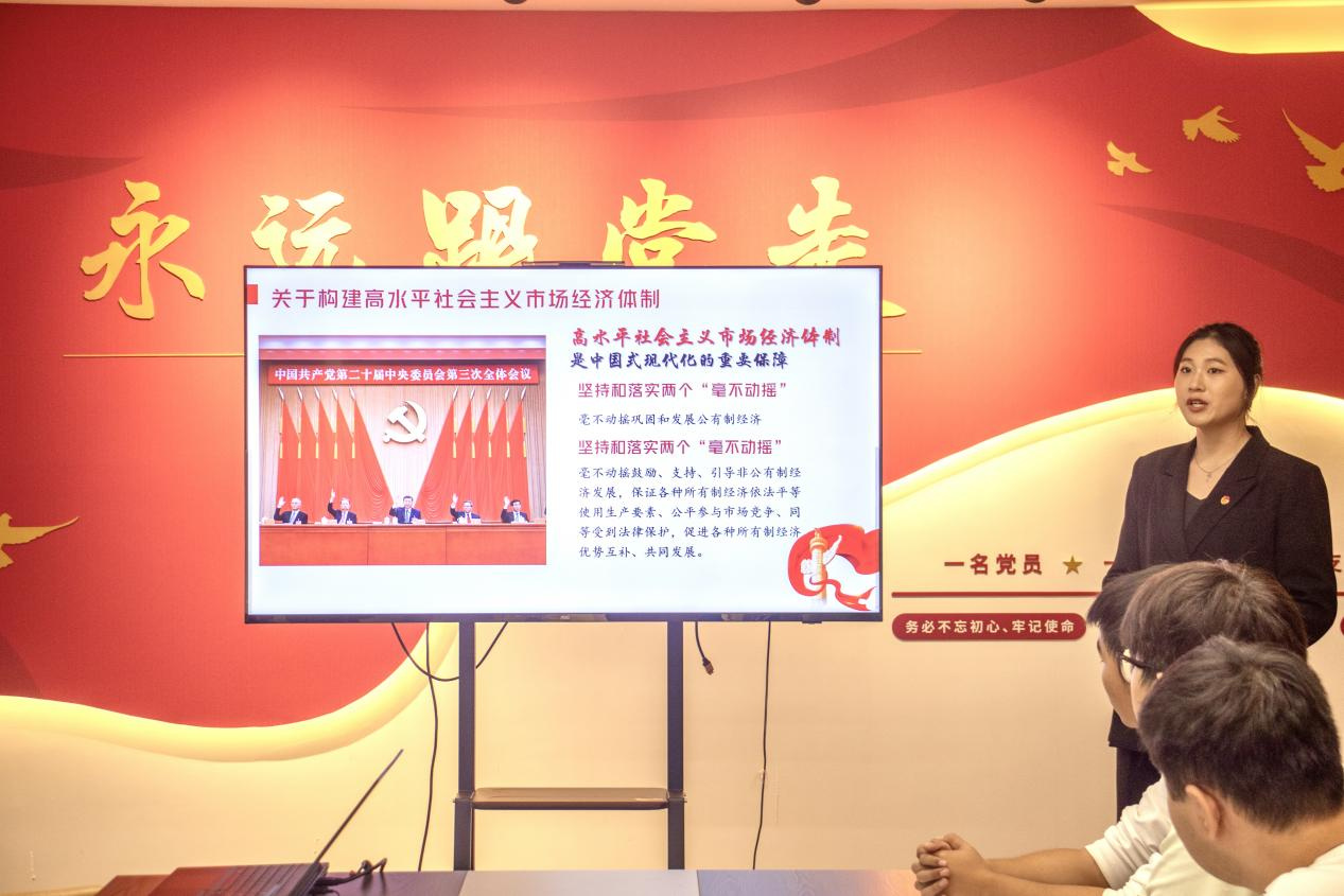 宣讲中,宣讲团成员紧密围绕党的二十届三中全会核心议题,进行了条理清晰、内容丰富的阐述。王丹丹从历史、现实、理论、世界四个维度,详细阐述了党的二十届三中全会对于在新征程上高高举起改革开放伟大旗帜,坚定不移走中国式现代化道路,推动构建人类命运共同体所具有的里程碑意义;杨阳以“数说全会”的形式,通过一个个数字解读全会精神,进一步阐释了全面深化改革的重大意义和总体要求;朱仔仪聚焦《中共中央关于进一步全面深化改革、推进中国式现代化的决定》中关于经济、民主和法治改革的相关内容,对全会精神进行了全面、系统、深入的宣讲。