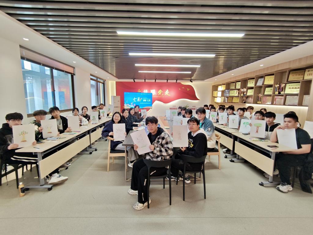 在“青心成长”环节,与会师生们以“向阳而生,‘树’说成长”为主题,一起绘制青春“成长树”。同学们用画笔在根系上勾勒支持自己的温暖力量,在树叶上书写成长的收获,在树干上描绘成长的轨迹,一棵棵形态各异的成长树跃然纸上。工244班李应鲲阐释自己的创作理念:“以诚信、责任为根基,以扎实的专业学习为枝干,用创新思维与健康体魄构建成长树冠。”会后,学院送给现场每一位同学一份“种子纸”,寓意未来能像种子一样,持续生长,不断突破。