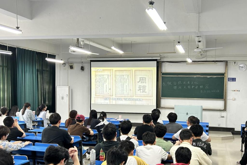 活动期间,各班团支书化身“礼仪宣讲员”,借助PPT多媒体演示,结合“课堂互动、宿舍相处、社团活动时的礼仪规范”“文明就餐”等校园生活中的具体案例,系统阐释礼貌、礼节、礼仪的内涵与现实意义,深入剖析了文明习惯对个人修养、人际交往及社会和谐的重要性。为深化教育效果,班会特别设置“礼仪影像课堂”环节,精选礼仪规范纪录片、校园礼仪微短剧等视频素材,内容从传统礼仪典故延伸至校园文明实践,通过具体场景演示礼貌用语、社交礼节和公共礼仪规范,引导学生沉浸式感受礼仪文化魅力,深化教育共鸣。会后,同学们探讨如何将“讲礼貌·守礼节·懂礼仪”融入学习生活,纷纷表示将努力践行文明礼仪。
