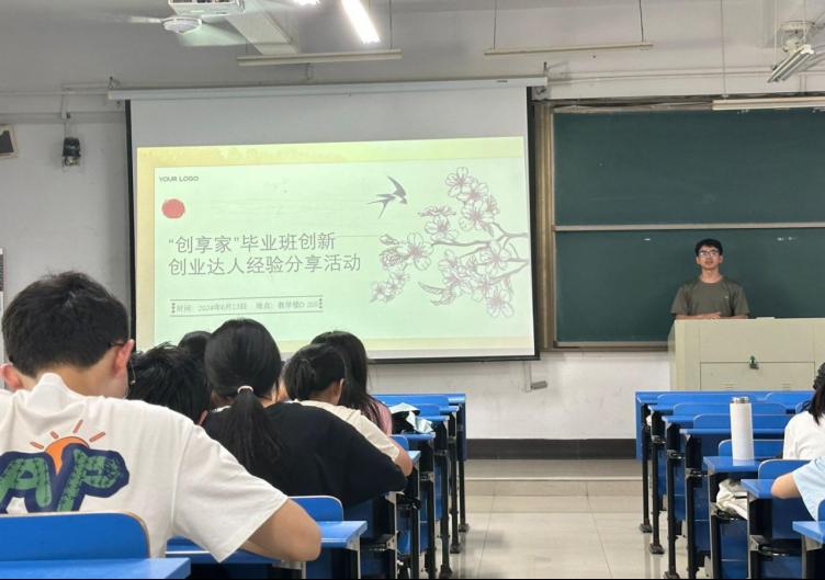 在东教D205举办“创享家”毕业班创新创业达人经验分享活动,活动由第十八届“挑战杯”全国大学生课外学术科技作品竞赛一等奖获得者物流工程202班陈磊主讲。