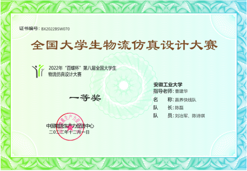 11月30日,历时近两个月的“百蝶杯”第八届全国大学生物流仿真设计大赛总决赛终于落下帷幕,参加总决赛的128支本科组队伍经过方案设计、讲解展示和运营对抗三个赛段的多轮激烈角逐,最终决出了各等级奖项。我校推选的“营养快线”队(队长陈磊,队员刘冶军、陈诗琪)始终秉承“百舸争流千帆竞,借海扬帆奋者先”的精神风貌,以昂扬的斗志和全力以赴的努力在全国总决赛中崭露头角,荣获“全国一等奖”,另有一支参赛队伍获得“全国三等奖”。此次比赛充分体现了我校学子既志存高远又脚踏实地的学习作风,展现了我校学子的孜孜以求和拼搏进取精神风貌。