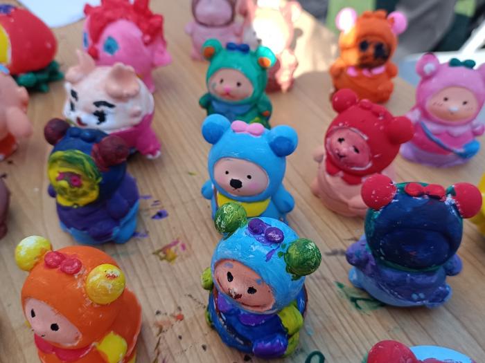 涂鸦解压是现场热度最高的活动。此项活动中,参与者通过不同色彩的搭配,为石膏娃娃、DIY创作面具、背包小熊、等自由涂色、自由创作,缓解同学压力。现场同学们和自己的朋友讨论如何配色让娃娃更漂亮,互相分享、欣赏其他人的作品。