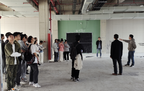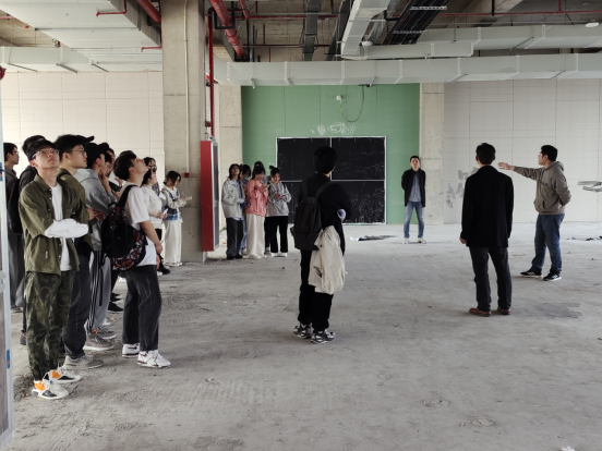 在带队老师及企业管理人员的带领下,同学们分3个批次批次到施工现场见习参观,先后参观了地下室机电管线排布、会议室毛坯房、智慧建造展厅,十七冶工程科技有限公司造价所所长徐文及相关技术人员给学生做了详细的解说。