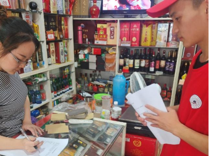 图为实践队员邀请居民快递点负责人填写调查问卷。