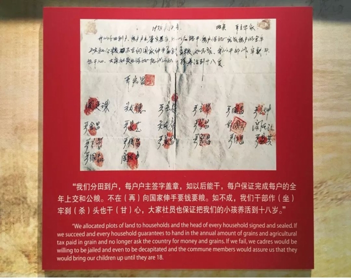 图为大包干18个村民红手印的“包产到户”生死契约。