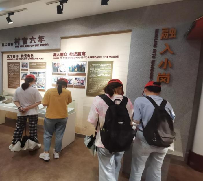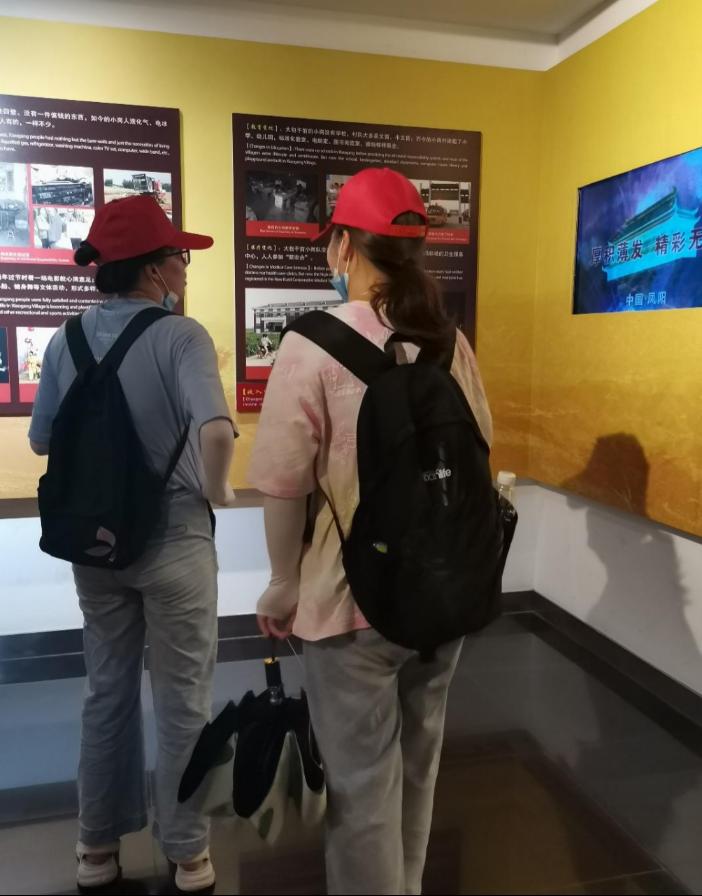 图为实践队员在通过展板了解实行大包干政策之后给小岗村发展所带来的巨大变化。