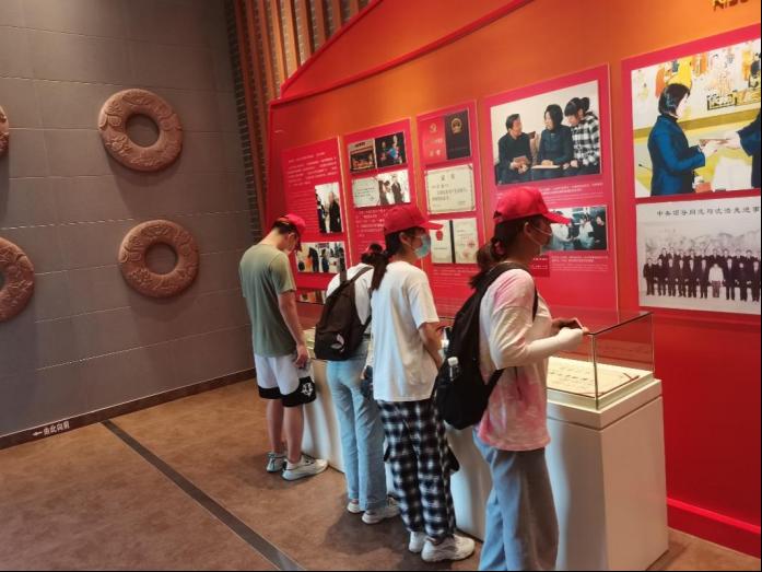 图为实践队员们观看沈浩同志在小岗村艰苦的条件下实干、创新所获得的荣誉和做出的功绩。