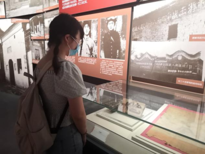 图中为实践队员在历史陈列馆中瞻仰革命文物