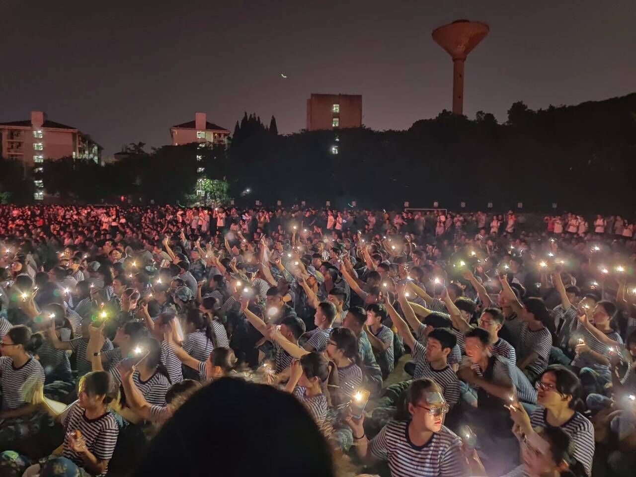 夜幕降临,田径场上灯光绚烂,迎新晚会盛大精彩。一群穿着迷彩服的学生正坐在操场上,一只手拿着带有安徽工业大学校徽的定制月饼,另一只手举起了已经打开手电筒的手机,随着晚会歌声的节拍在空中摇动,同学们的灯光汇成一片星海。他们欢声笑语,幸福洋溢在一个个年轻而又活力的面庞上,他们从祖国大江南北而来,相聚在安徽工业大学,相聚在U球直播