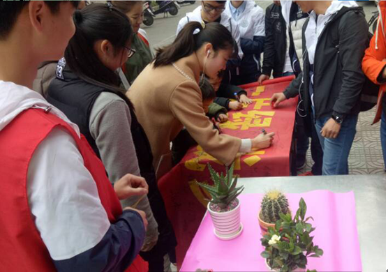 上午8点,志愿者们带着自己买的20余盆盆栽做好准备来到了三食堂门口。本次义卖由工业工程162班志愿者策划参与,义卖的盆栽大多都是同学们喜欢的多肉植物、防辐射的仙人球、栀子花等植物,所获的全部受益将用于下次班级同学慰问敬老院老人。在听完完志愿者们的活动目的介绍后,不少同学前往选购盆栽,并在“一人一片绿,我参与”的志愿横幅上签名。不到2小时,盆栽被抢购一空。