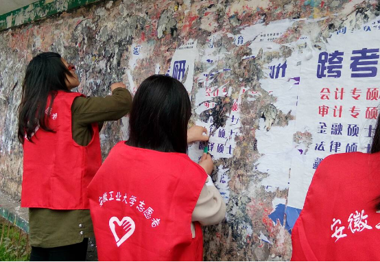 下午,志愿者们一行来到了本部宣传栏、寝室楼、教学楼等地的广告宣传栏处,分组展开了清理活动。大家分区域设立小组负责人准备好了小刀、抹布、垃圾袋、垃圾桶等清洁工具,井然有序地工作起来。大家认真清除了小广告、过期海报等,并把垃圾放在随身带的袋子和垃圾桶里。最终经过两个小时的努力,宣传栏墙壁上的各类广告基本清除干净,墙壁恢复了原貌。清理活动结束后,大家不忘清扫地面上在清除过程中掉落的纸屑。