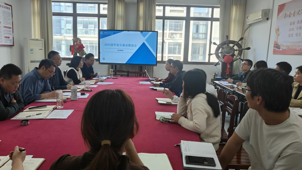 于汇文楼A302召开2025届毕业生就业工作推进会。学院全体领导班子、各系室主任、党支部书记、教师代表、各年级辅导员参会。本次会议聚焦考研升学、校招推进、就业服务等关键环节的工作推进。