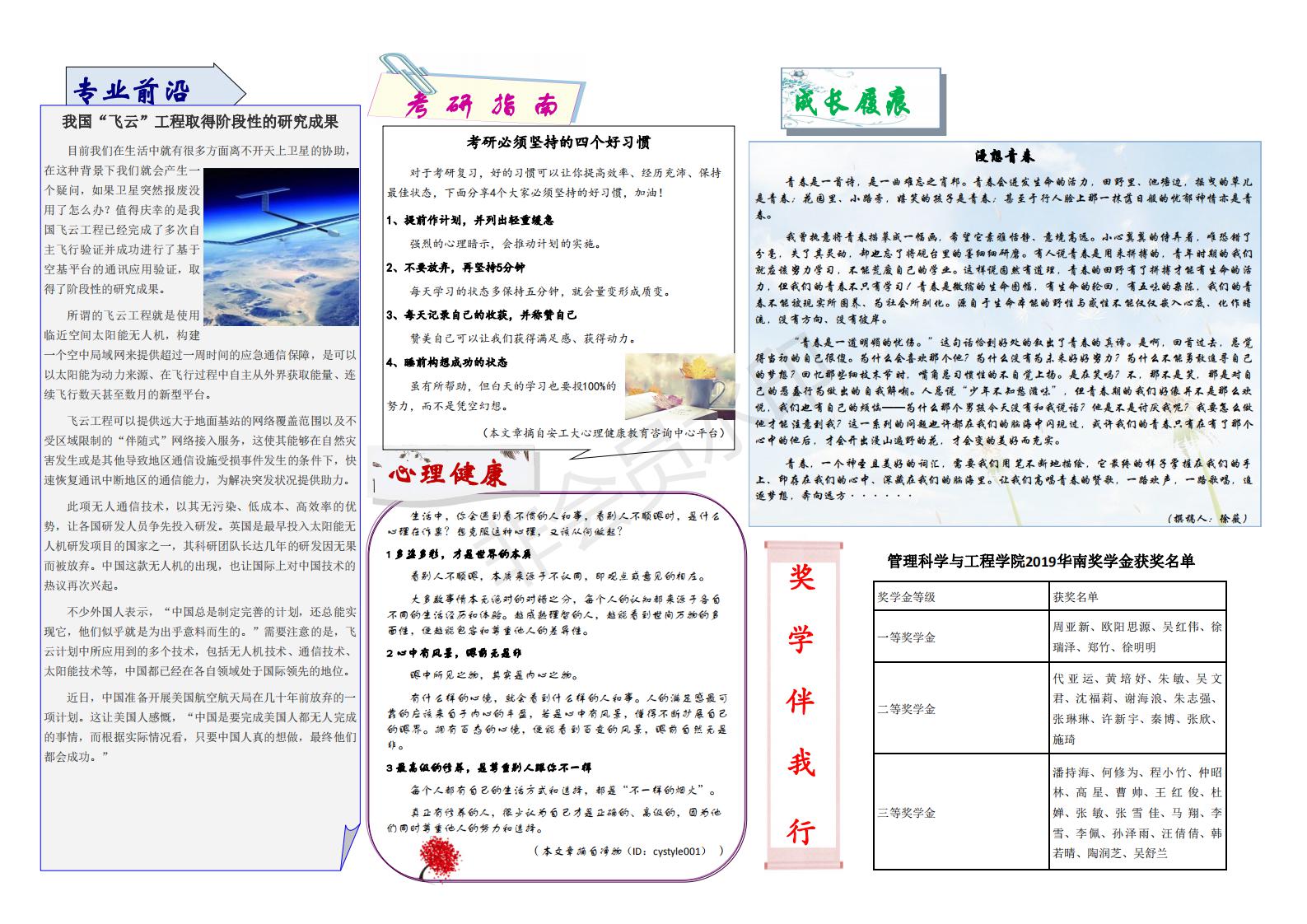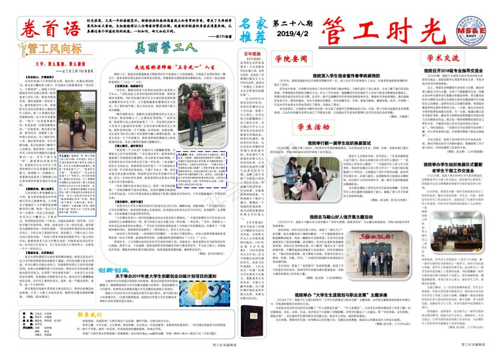 管工时光为U球app 院报宣传平台,负责学院传统媒体报纸的编辑、策划与排版,与月刊、半月刊的形式对U球app 近期重大活动事件进行综合报道,同时根据国家实事推出专刊。特设诗话管工环节,鼓励学生原创诗歌投稿,激发学生创作热情。以下为管工时光第二十八期第一、二版:
