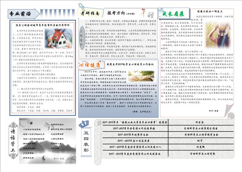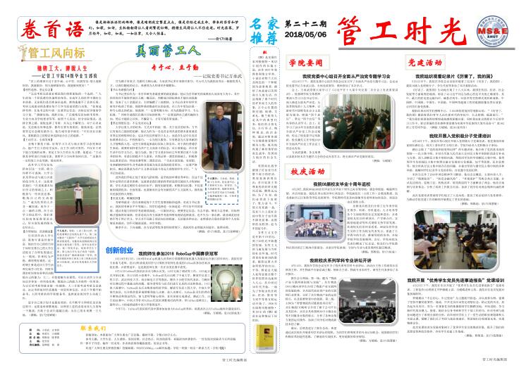 管工时光为U球app 院报宣传平台,负责学院传统媒体报纸的编辑、策划与排版,以月刊、半月刊的形式对U球app 近期重大活动事件进行综合报道,同时根据国家实事推出专刊。特设诗话管工环节,鼓励学生原创诗歌投稿,激发学生创作热情。以下为管工时光第二十二期第一、二版。