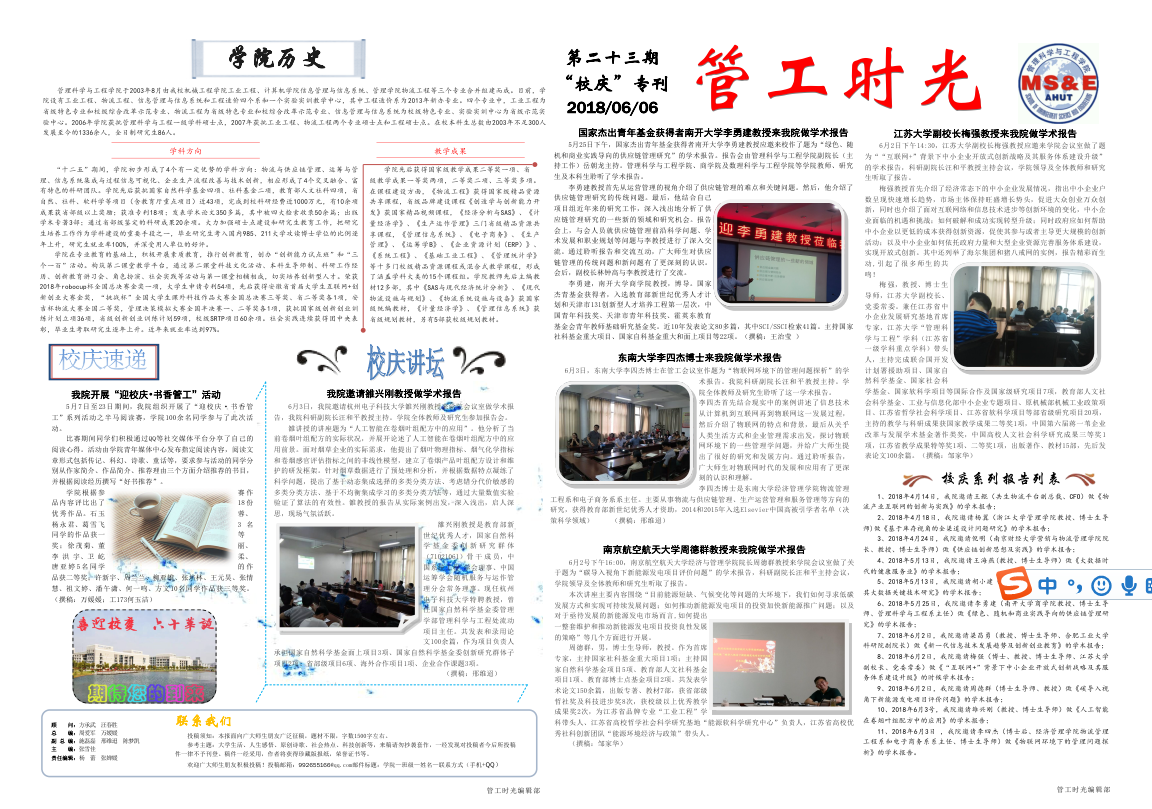 管工时光为U球app 院报宣传平台,负责学院传统媒体报纸的编辑、策划与排版,与月刊、半月刊的形式对U球app 近期重大活动事件进行综合报道,同时根据国家实事推出专刊。特设诗话管工环节,鼓励学生原创诗歌投稿,激发学生创作热情。以下为管工时光第二十三期第一、二版:
