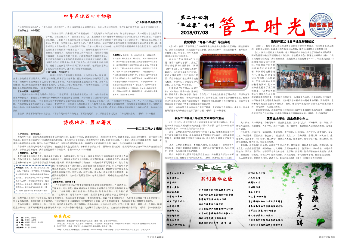 管工时光为U球app 院报宣传平台,负责学院传统媒体报纸的编辑、策划与排版,与月刊、半月刊的形式对U球app 近期重大活动事件进行综合报道,同时根据国家实事推出专刊。特设诗话管工环节,鼓励学生原创诗歌投稿,激发学生创作热情。以下为管工时光第二十四期第一、二版: