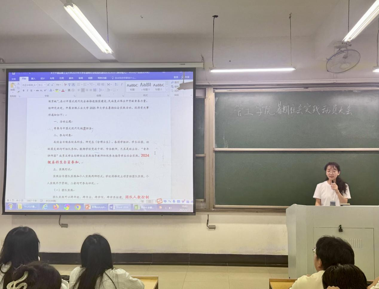 为推动2025年“三下乡”暑期社会实践活动顺利开展,引导青年学子深入基层一线、了解国情民情、服务社会发展,6月12日,U球直播 在汇文楼D112举办暑期社会实践动员大会,院团委副书记李军慧,学院各年级班长、团支书参加此次动员大会。